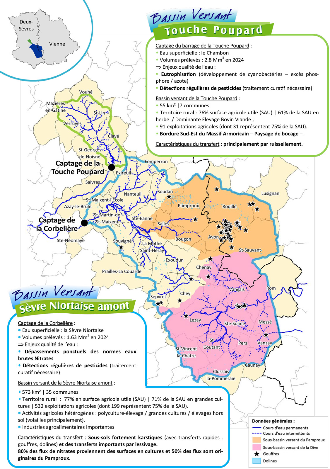 - Le bassin versant de la Sèvre Niortaise amont, alimentant le captage de La Corbelière (exploité par la Régie eau de la Communauté de communes Haut Val de Sèvre)