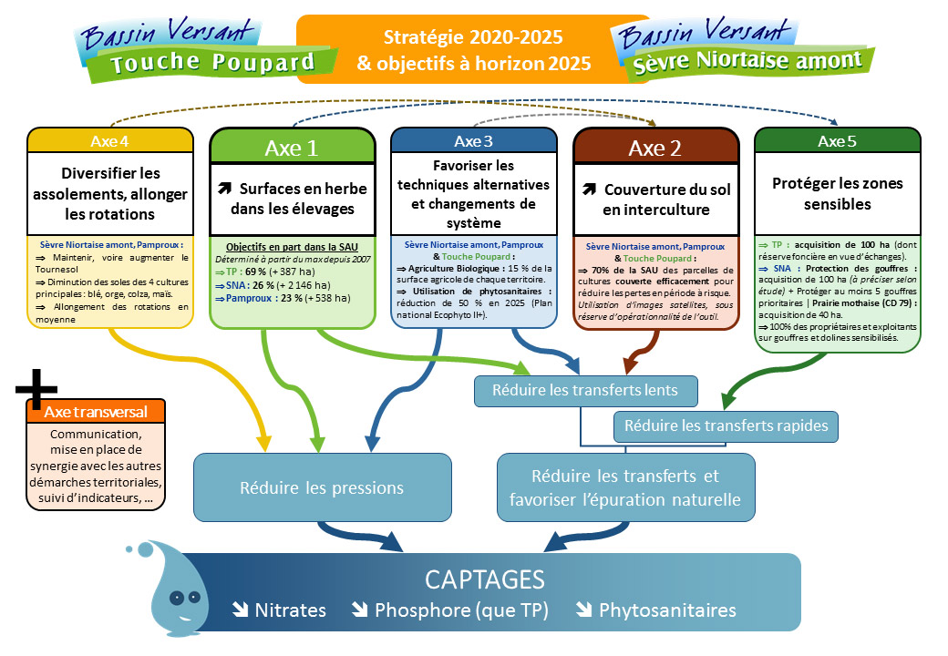 La stratégie territoriale identifie six axes stratégiques pour atteindre durablement une bonne qualité d’eau. Cette stratégie se veut ambitieuse (transition fourragère, changements de pratiques…), mobilisatrice sur le territoire (renforcement du partenariat avec les organisations professionnelles agricoles, recherche d’une plus grande proximité avec les collectivités et de synergie avec les autres démarches territoriales, renforcement de la communication notamment vers les habitants,…) mais aussi pragmatique et réaliste (outil de diagnostic adapté, approche économique des actions menées dans les exploitations… ) en prenant en compte les facteurs extérieurs influençant fortement l’agriculture du territoire.