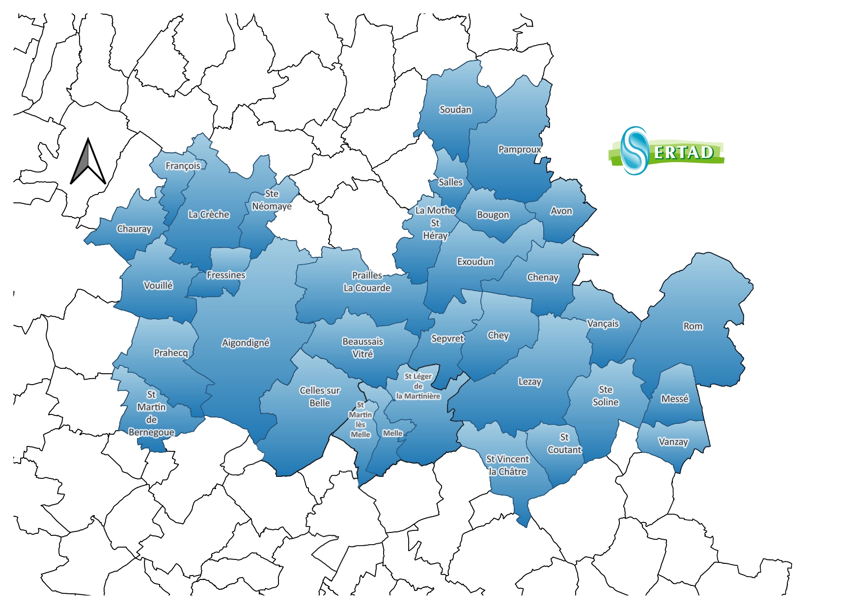 Le syndicat dessert 31 communes soit environ 28 000 branchements ce qui représente un linéaire de réseau de 1 265 kms. Le SERTAD vend de l’eau traitée au syndicat 4B, à la Communauté de Communes Haut Val de Sèvre et à la Communauté d’Agglomération du Niortais. Il assure également un secours en cas de besoin pour le SECO et la Communauté d’agglomération du Niortais.